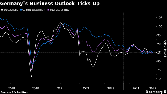 “德国经济处于观望状态,”Ifo总裁Clemens Fuest周一发布公告称。“虽然企业对当前业务的满意度略有下降,但预期有所改善。”